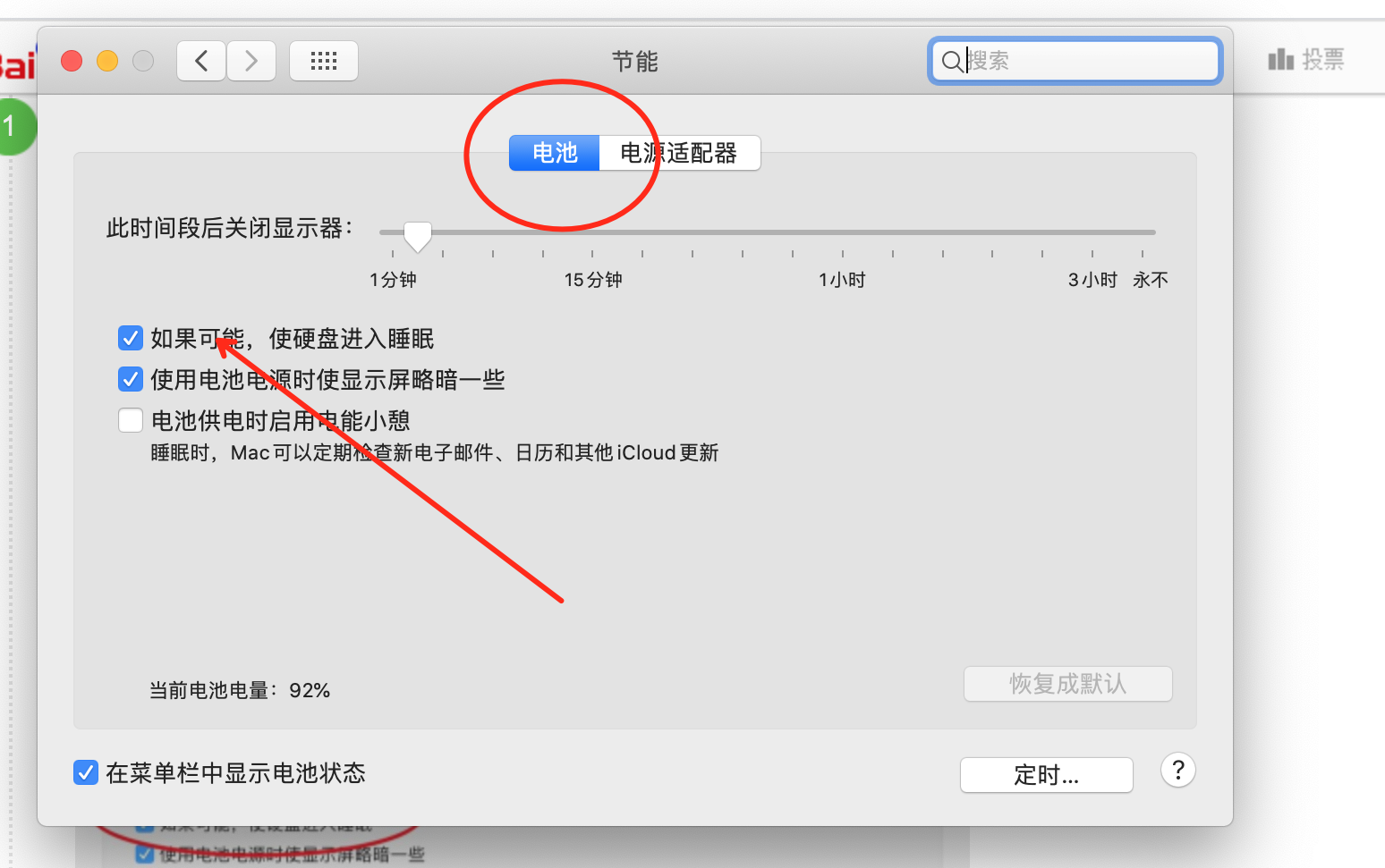 先点击电脑上设置,点击[节能],点击[电池],把[硬盘随眠]这个勾上,同样的把[电源]里面的硬盘睡眠项也勾上。如果勾上了还是无法唤醒,请看下面的步骤。