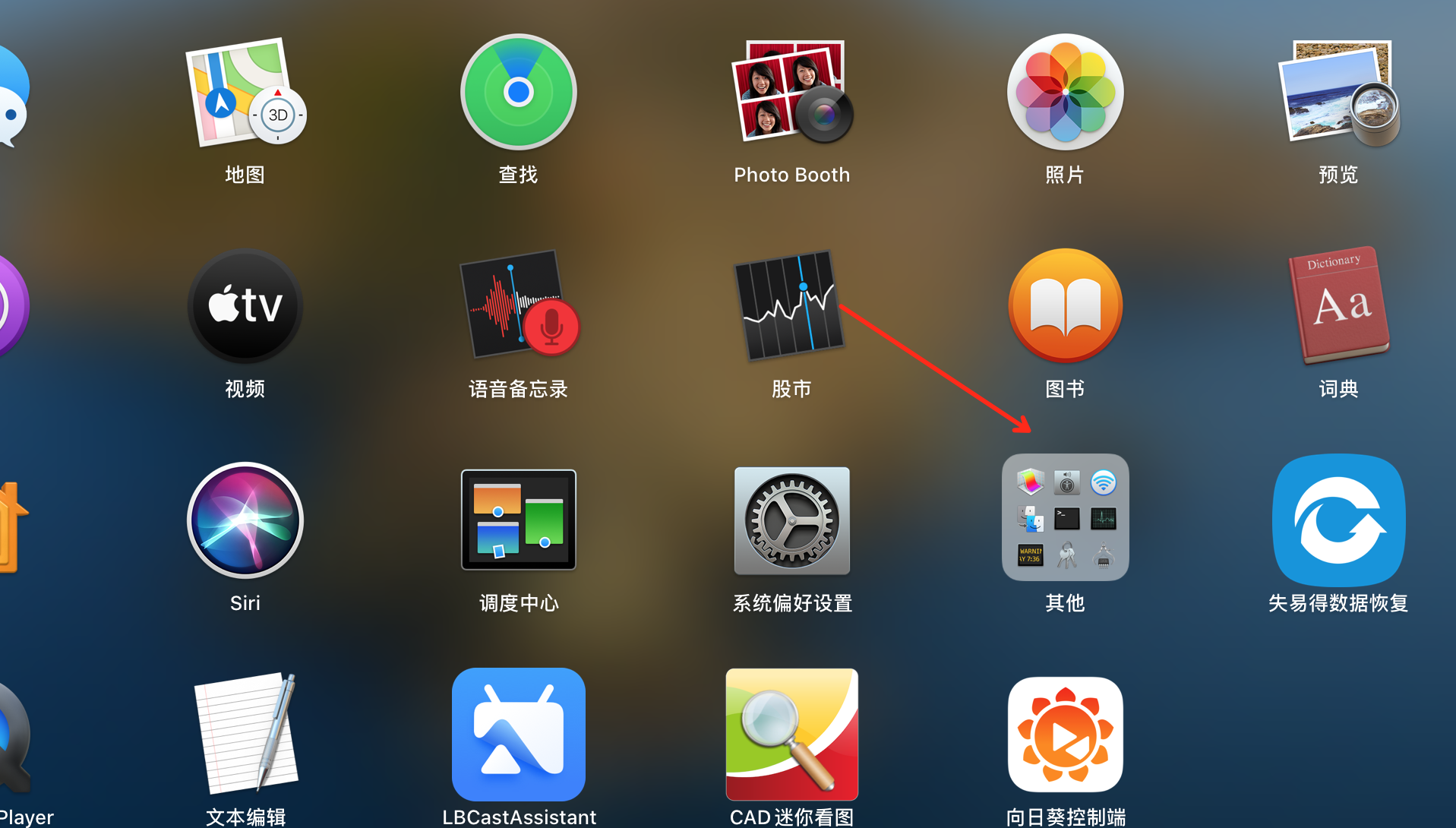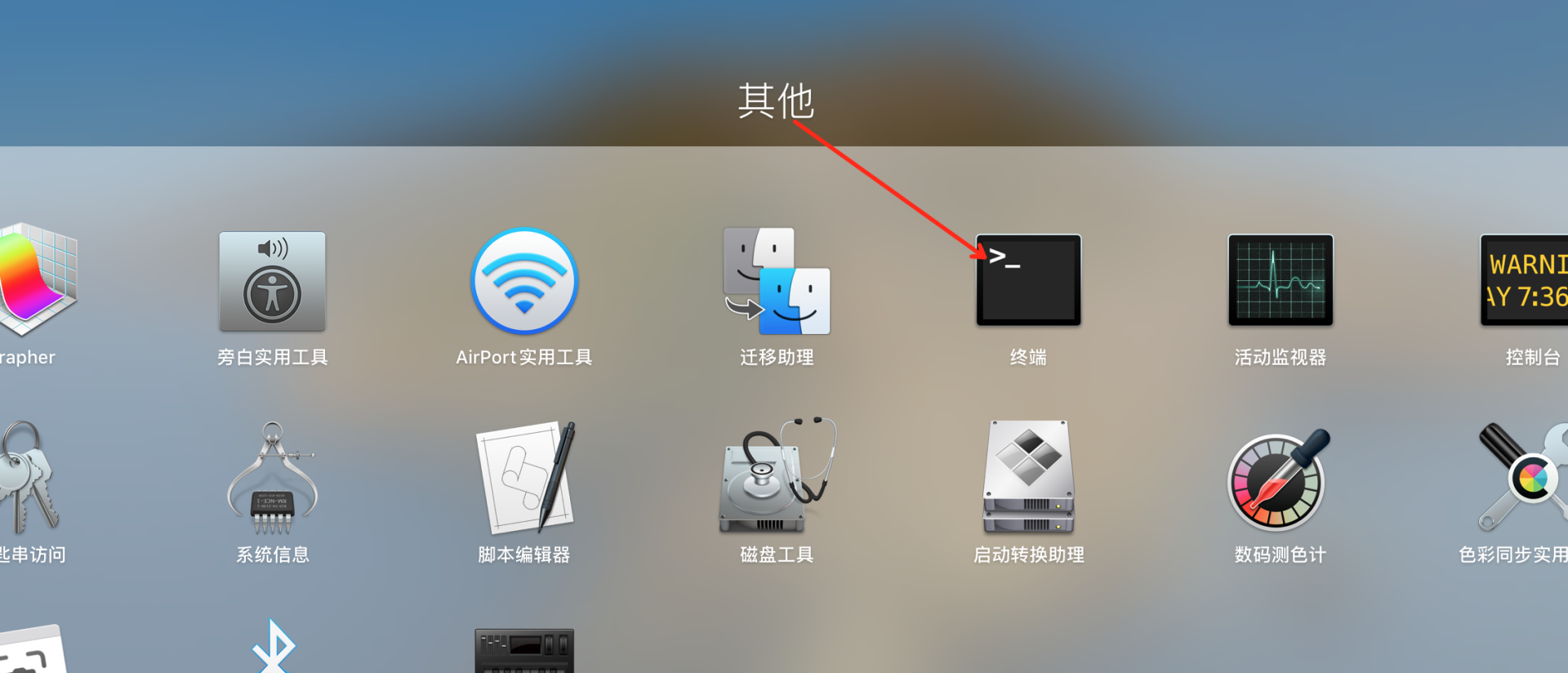 打开启动台,找到如下图显示的其他,然后打开终端;